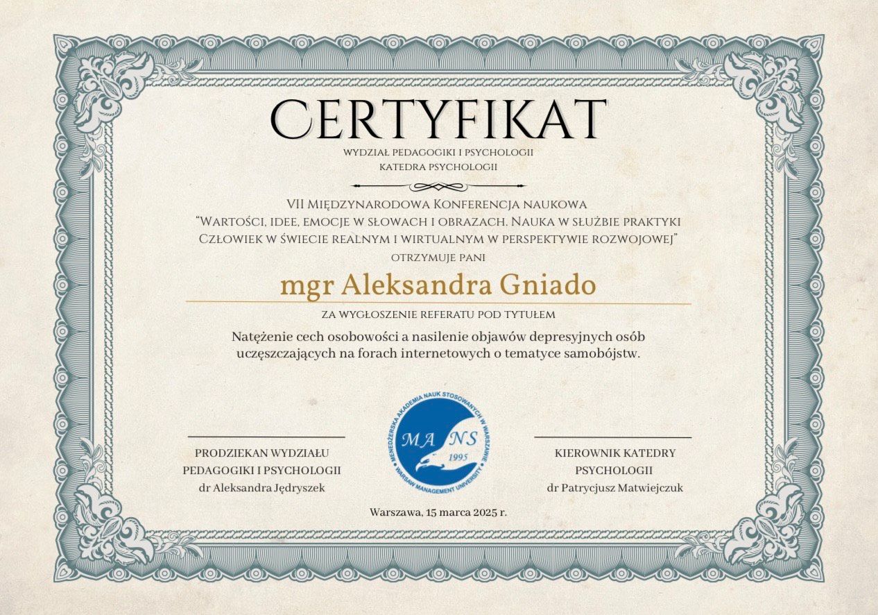 - "Natężenie cech osobowości a nasilenie objawów depresyjnych osób uczęszczających na forach internetowych o tematyce samobójstw." - referat wygłoszony podczas VII Międzynarodowej Konferencji naukowej: “Wartości, idee, emocje w słowach i obrazach. Nauka w służbie praktyki Człowiek w świecie realnym i wirtualnym w perspektywie rozwojowej”